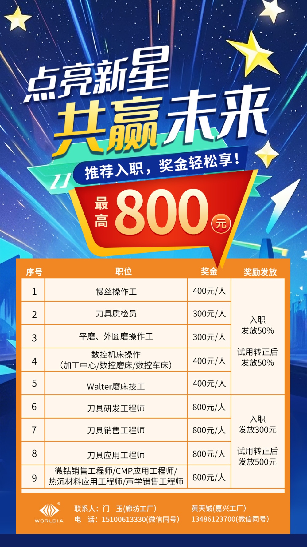 内推 | 点亮新星,共赢未来——推荐入职,最高800元奖金轻松享! 2025-02-26 11:39:43 北京沃尔德金刚石工具股份有限公司 浏览次数 1852 上一条一月&二月|沃尔德员工生日会 下一条没有了