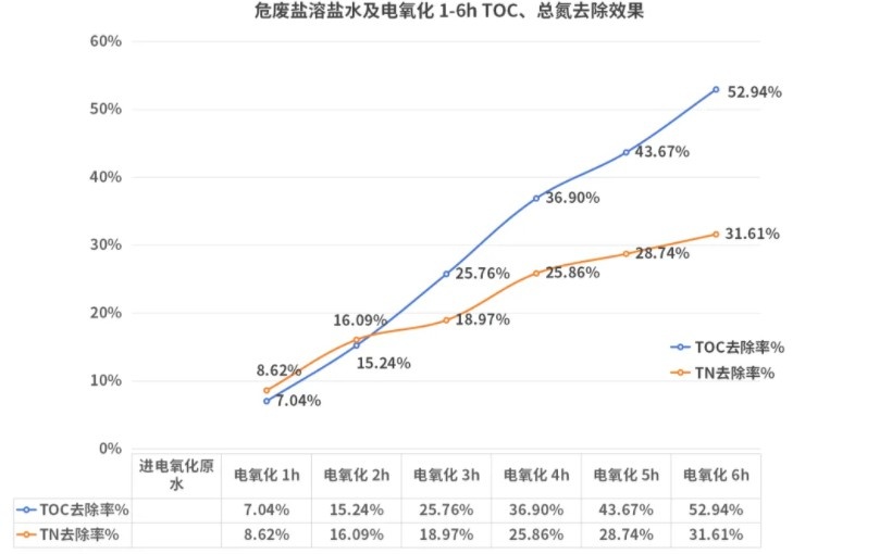 ▲危废盐溶盐水及电氧化 1-6h TOC、总氮去除效果