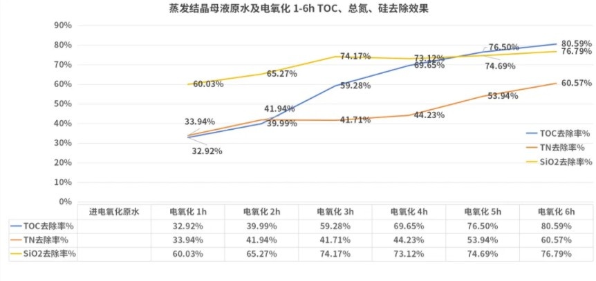 废盐蒸发结晶母液作为化工生产过程中产生的另一种高盐高浓度废水,其处理难度同样不容忽视。在相同条件下,利用沃尔德BDD电极对废盐蒸发结晶母液进行6小时电氧化处理,TOC去除率升至80.59%,总氮去除率达到60.57%,硅去除率也高达76.79%。