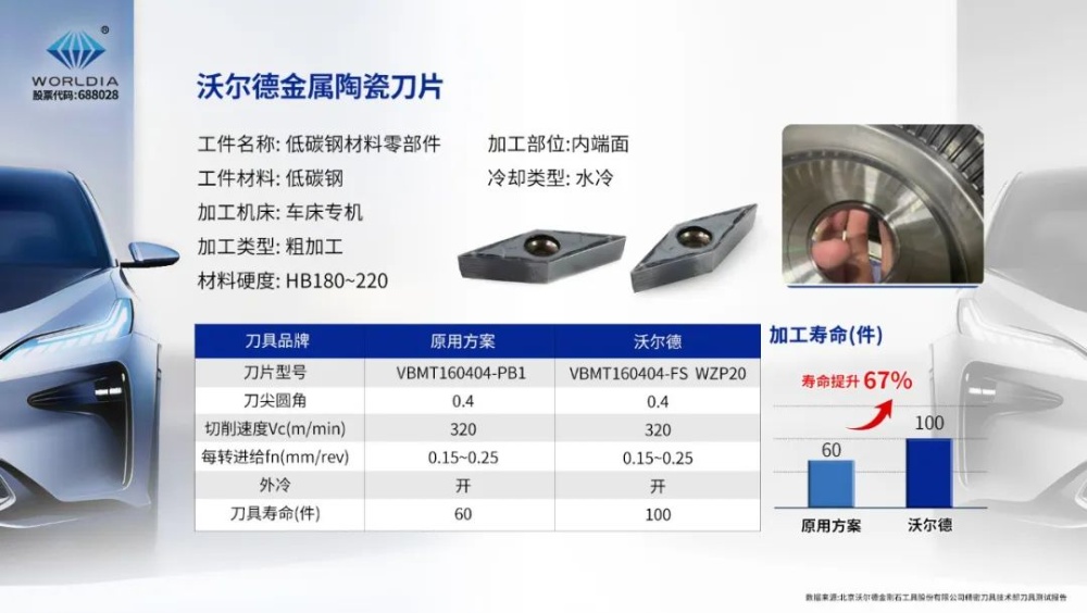 例如,某AT变速器生产企业,主要以生产低碳钢材料零部件为主。在自动化生产过程中,由于材料硬度较软,导致车削加工中经常出现不断屑的情况,刀具寿命不稳定,生产效率也大打折扣。我们了解工况后,适配更加合适的断屑槽。优化参数后,工件缠屑问题得到解决;同时考虑到材料特性,选用了能够适应高Vc(线速度)的金属陶瓷刀片,刀具寿命从设定60件提高到100件,有效改善了缠屑问题,获得用户高度评价。