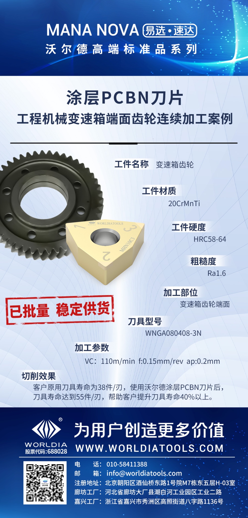 工程机械变速箱端面齿轮连续加工案例 | MANANOVA 涂层PCBN刀片 2022-04-28 10:21:16 北京沃尔德金刚石工具股份有限公司 浏览次数 5621 上一条齿轮内孔连续加工案例 | MANANOVA 涂层PCBN刀片 下一条小发动机缸体加工案例 | MANANOVA PCBN标准刀片