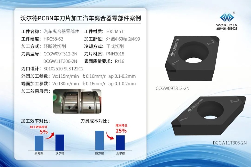 在汽车制造业中,汽车离合器主盘毂的加工一直是一个技术难题。其材质坚硬,加工过程中要求刀具具备高强度、高抗冲击性以及优异的耐磨性。近日,沃尔德凭借创新的PCBN车刀片方案在汽车离合器主盘毂加工中展现出了出色的性能。在相同工况下,沃尔德方案的PCBN车刀片展现了出色的性能。该方案通过增加刃口倒圆设计,显著提高了刃口的强度和抗冲击性。这一创新设计使得刀片在加工过程中能够更好地抵抗冲击和磨损,从而延长了刀具的使用寿命。同时,采用PNH2018超细粒度PCBN材质,使得刀片具备了优秀的刃口抗崩性。这种材质既兼顾耐磨性又具备抗冲击性,能够在加工连续到中断续的淬硬钢时保持稳定的切削性能,大大减少了崩刃现象。除了材质和设计的创新外,沃尔德方案的PCBN车刀片还采用了C2涂层技术。这种涂层能够有效提高刀片的耐磨性和抗腐蚀性,保护刀片免受切削热和切削力的影响。同时,C2涂层还能改善加工表面的质量,减少粗糙度数值,提高产品的整体质量。与原刀具方案相比,沃尔德方案的加工效率提升了5%,这意味着在相同的加工时间内,沃尔德方案能够完成更多的工作量,提高了生产效率。此外,刀具成本还降低了25%,这为企业节省了大量的成本支出,提高了经济效益。综上所述,这种方案对于需要连续到中断续加工淬硬钢等高强度材料的企业来说,无疑是一个理想的选择。