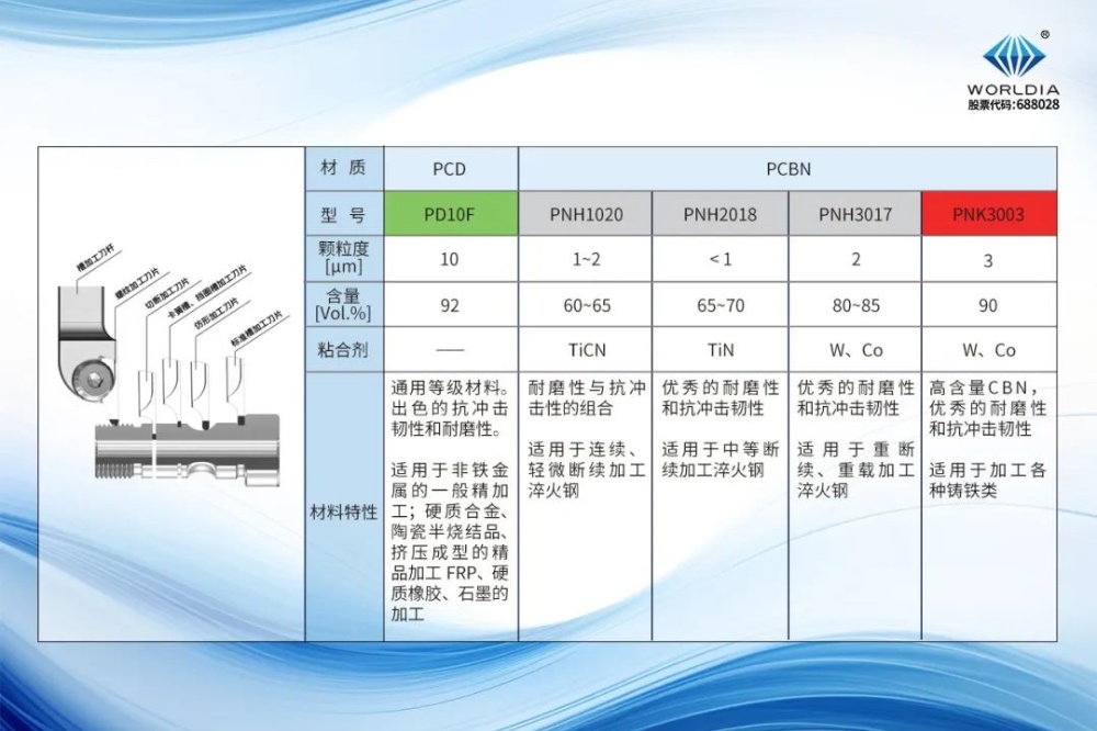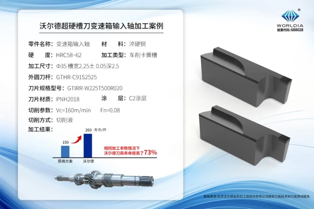 案例分析:在某一加工案例中,客户原方案采用进口PCBN非涂层槽刀片,后转而选用沃尔德C2涂层PNH2018 PCBN材质刀片。PNH2018材质凭借其卓越的刃口抗崩性,在轻至中断续淬硬钢加工中表现优异。加之C2涂层的加持,进一步提升了刀片的耐磨性与耐热性。同时,沃尔德切槽刀杆螺钉与定位槽双夹紧及定位方式,为该加工方案提供了三重可靠保证。最终,这一解决方案不仅大幅为客户提高了刀具寿命,还有效减少了停机换刀时间,提高了机床的利用率,为客户节省了宝贵的时间成本。