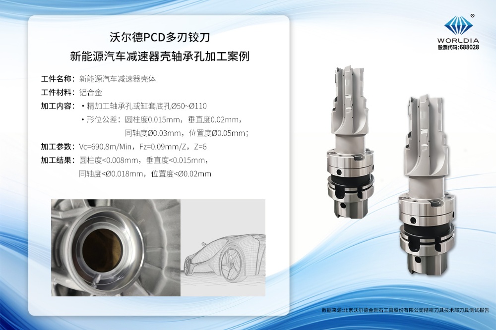 揭秘!沃尔德PCD多刃铰刀如何加工新能源汽车减速器壳轴承孔 2024-07-25 13:50:08 北京沃尔德金刚石工具股份有限公司 浏览次数 3840 一、案例背景:沃尔德PCD多刃铰刀近年来,国际油价攀升与国家政策扶持共促新能源汽车产业快速增长,其核心部件——电机系统、电控系统、电池仓及热管理系统的零部件加工,已成为生产厂商与刀具制造商共同瞩目的焦点。本案例为沃尔德公司生产的PCD多刃铰刀加工新能源汽车减速器壳轴承孔加工方案。二、案例介绍:沃尔德PCD多刃铰刀三、方案特点:沃尔德PCD多刃铰刀●焊接式多刃铰刀,PCD刃口可以重磨降低刀具成本;●法兰刀柄连接,可以弥补机床主轴的缺陷,满足孔径高精度加工的需求;●多刃设计结构,相比导条刀具,提高加工效率,保证精度前提下降低使用成本。 上一条新品发布 | 沃尔德PCBN刮削刀具及配套PSC刀柄系统 下一条沃尔德PCD复合精镗刀:新能源汽车电机壳定子孔加工的精密之选