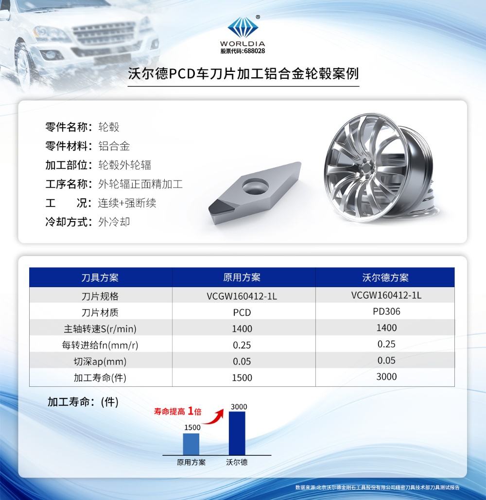寿命跃升一倍 | 沃尔德PCD车刀片加工铝合金轮毂案例 2024-09-20 15:44:22 北京沃尔德金刚石工具股份有限公司 浏览次数 3889 一、应用背景:沃尔德PCD车刀片加工铝合金轮毂案例铝合金轮毂由于重量轻、散热快、减震性好、外观多样时尚、尺寸精确、平衡好、容易制造等特点广泛应用于乘用车。本案例为沃尔德PCD车刀片加工铝合金轮毂外轮辐案例。二、案例介绍:沃尔德PCD车刀片加工铝合金轮毂案例三、沃尔德刀具特点:沃尔德PCD车刀片加工铝合金轮毂案例● 针对强断续切削采用特殊刃口设计,加强刃口强度和刚性;● 采用抗冲击PCD材质PD306,增加刃口韧性;● 沃尔德公司可以根据客户不同的加工需求,提供不同的刀具方案。 上一条以铣代磨 切削无忧 | 沃尔德FMP-LN套式面铣刀加工机床床身案例 下一条CV-Joint星形套外球面硬车加工 | 沃尔德助力新能源汽车制造