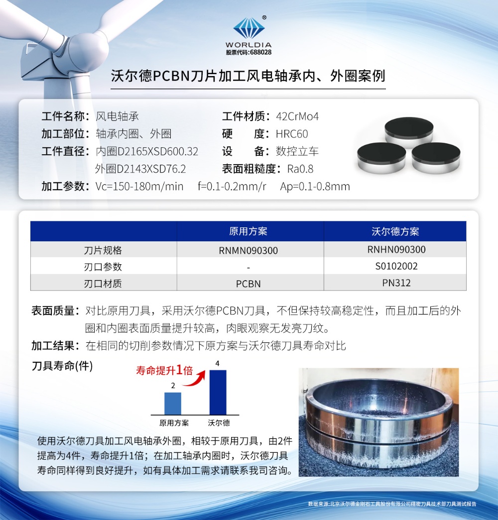 卓越性能,寿命提升 | 沃尔德PCBN刀片加工风电轴承内、外圈案例 2024-10-23 09:41:25 北京沃尔德金刚石工具股份有限公司 浏览次数 3151 一、背景介绍:沃尔德PCBN刀片加工风电轴承案例风电行业轴承有以下加工难点:● 工件材料硬度高,热处理后硬度在HRC58-62,对刀具耐磨性有很高要求;● 零件尺寸大,风电回转支持轴承直径通常超过1m,刀具要求有持续抗高温能力;● 热处理后零件变形造成余量不均匀,以及轴承滚道形状等因素,要求刀具有抗断续加工能力;● 加工精度和粗糙度要求高,工件的装配精度高对其尺寸公差和形状公差有很高的要求,其公差范围通常在0.03-0.05mm,表面粗糙度要求在Ra0.8以上。二、案例详情:沃尔德PCBN刀片加工风电轴承案例 上一条沃尔德合金刀片铸铁铣削案例:自研纳米PVD涂层,超细晶粒基体,成功实现国产化替代 下一条以铣代磨 切削无忧 | 沃尔德FMP-LN套式面铣刀加工机床床身案例