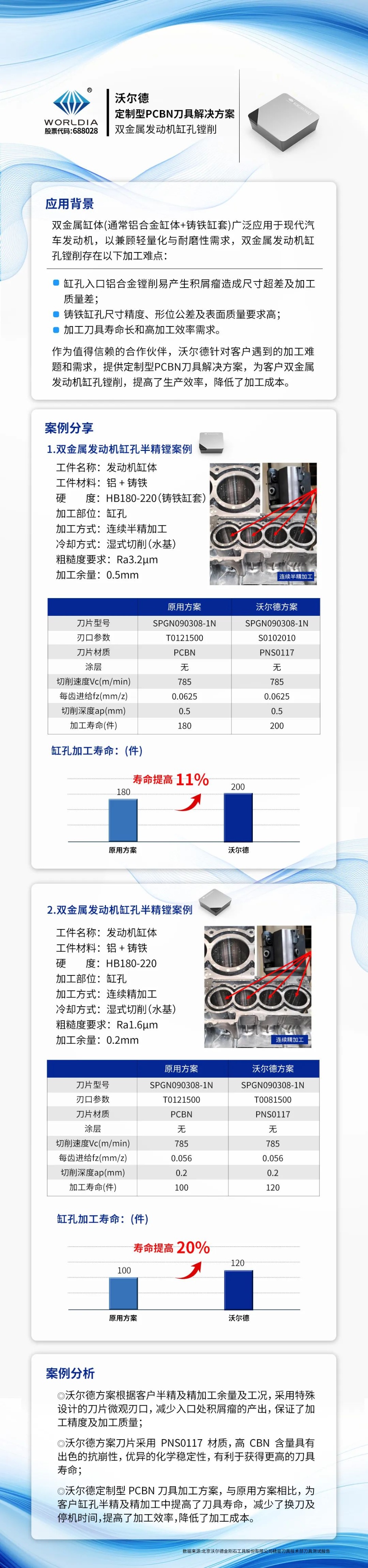 沃尔德定制型PCBN刀具解决方案-双金属发动机缸孔镗削 2025-07-15 08:47:16 北京沃尔德金刚石工具股份有限公司 浏览次数 381 上一条人形机器人零部件加工 | 沃尔德RV减速器行星齿轮套及小齿轮内孔加工案例 下一条沃尔德定制型PCBN刀片应用-差速器行星齿轮加工方案